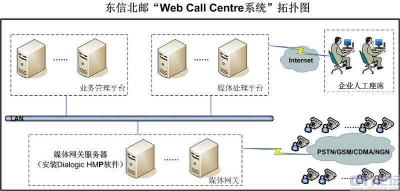 隨著中國經(jīng)濟的快速發(fā)展,越來越多的企業(yè)尤其是中小企業(yè)對呼叫中心的需求量越來越大,需求質(zhì)量也越來越高。由于呼叫中心建設涉及技術(shù)十分專業(yè)、涉及領域也比較廣泛、必須投入巨大的資金購買軟硬件設備,并且需要大量的維護力量,因此對于中小企業(yè),尤其是缺乏專業(yè)技術(shù)力量和資金的中小企業(yè)來說,建設自有的呼叫中心顯得不切實際。正是基于這種情況,EB開始與Dialogic合作,采用其HMP系統(tǒng)軟件,以IP技術(shù)為基礎,依托電信網(wǎng)絡,建設呼叫中心系統(tǒng),以托管方式為客戶提供呼叫中心服務,即Web Call Centre服務。