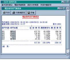 TeleSMDR話務分析計費系統(tǒng),是一套搭配舜遠交換機的專屬電話計費系統(tǒng)。TeleSMDR 為您詳細記錄每一通外撥的電話通話時間、撥號號碼等,并且還提供完整電話帳及查詢報表、電話費用攤提等功能,如您可查詢特定分機在特定日期是否有打過國際電話。公司內所有分機的通話時間、通話費、撥號號碼等將在計算機上一覽無遺。