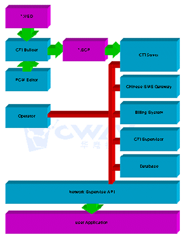 說明:圖中所有的設(shè)備都是通過網(wǎng)絡(luò)和CTI服務(wù)器交互的,我們內(nèi)部都是通過遠(yuǎn)程監(jiān)控API接口與服務(wù)器通信,也就是說,只要用戶可以按照遠(yuǎn)程監(jiān)控API的規(guī)范開發(fā)出具有自己特色的計費系統(tǒng)、監(jiān)控系統(tǒng)等等。