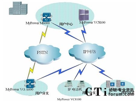 在用戶中心部署MyPower VC8100 IP通信服務器,同時部署MyPower M6000媒體網關,在用戶分支機構部署邁普公司小型媒體網關、IP電話機及軟電話,構建以SIP協(xié)議為基礎的高擴展性VOIP協(xié)同通信平臺。