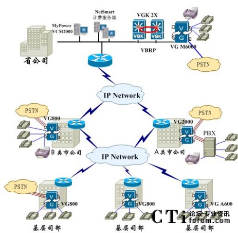 在此典型應用中,省公司采用VG M6000,配置32FXO接入卡和E1中繼卡,實現大容量接入和本地PSTN落地;地市B采用VG800,配置FXO模擬接入卡和FXS模擬中繼卡,實現本地電話接入和PSTN落地;地市A采用VG2000,將PBX電話接入IP電話網絡,并實現本地PSTN落地;基層公司根據容量需求,分別采用VG800或者VG A600實現電話接入。省公司配置兩臺邁普IP語音網守VGK 2X,運行VBRP協議,實現網守熱備,充分保證整個網絡的可靠性。
