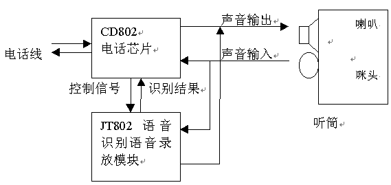 本方案主要由電話機芯片CD802加語音識別錄放模塊JT802構成。