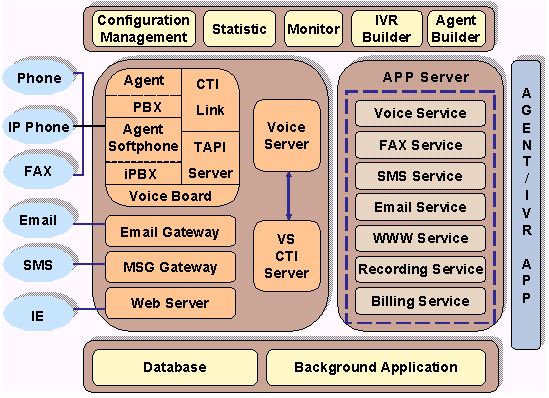 包括普通PBX、新型的IP PBX、各類語音板卡(包括進(jìn)口的和國產(chǎn)的)、Email網(wǎng)關(guān)、SMS網(wǎng)關(guān)等等,VoiceServer和VS CTI Server負(fù)責(zé)將這些信息收集在一起,供應(yīng)用服務(wù)器使用;同時VoiceServer和CTI Server同時將各種數(shù)據(jù)和信息進(jìn)行解釋,將任務(wù)提交給各種硬件和接入設(shè)備執(zhí)行。