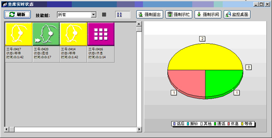 當(dāng)前座席狀態(tài):能夠提供座席的狀態(tài)表示,狀態(tài)持續(xù)時(shí)間,對(duì)應(yīng)的技能組,對(duì)應(yīng)的分機(jī)號(hào)碼,對(duì)應(yīng)的IP地址等信息?梢詫(duì)任何一個(gè)座席進(jìn)行強(qiáng)制簽出、強(qiáng)制示忙、強(qiáng)制示閑操作?梢詫(duì)任意座席進(jìn)行屏幕監(jiān)控操作(無(wú)需任何第三方軟件)。