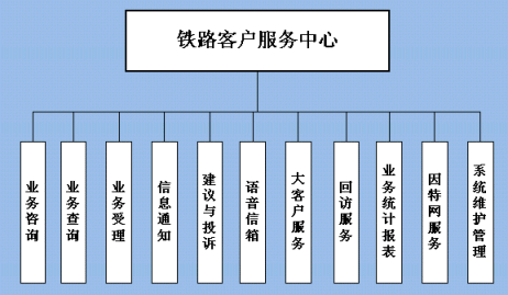 鐵路客戶服務(wù)中心系統(tǒng)的業(yè)務(wù)功能結(jié)構(gòu)如下圖所示: