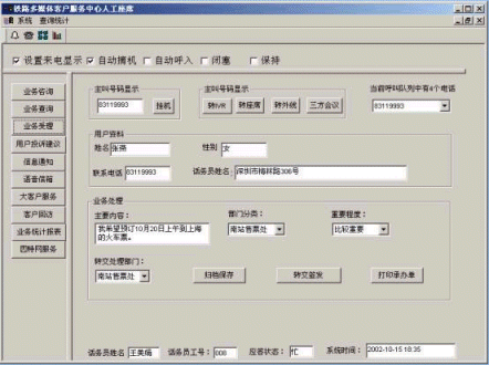 客戶服務(wù)中心(呼叫中心,Call Center)是現(xiàn)代信息技術(shù)和通信技術(shù)相結(jié)合,通過電話、傳真和因特網(wǎng)等形式接觸客戶,并向客戶提供服務(wù)的新途徑。它是伴隨信息技術(shù)的發(fā)展和服務(wù)水平提高而發(fā)展起來的一種新興技術(shù),其發(fā)展的速度以及由此帶來的沖擊力,與因特網(wǎng)不相上下,而其使用人數(shù)、使用容易度和廣泛性則超過因特網(wǎng)。呼叫中心為電信經(jīng)營者帶來了巨大的運行效益,成為創(chuàng)造更高附加值的有力手段。對于鐵路交通運輸業(yè),客戶服務(wù)中心則是與客戶建立聯(lián)系和有效溝通的新媒介,是沒有物理柜臺的營業(yè)廳。