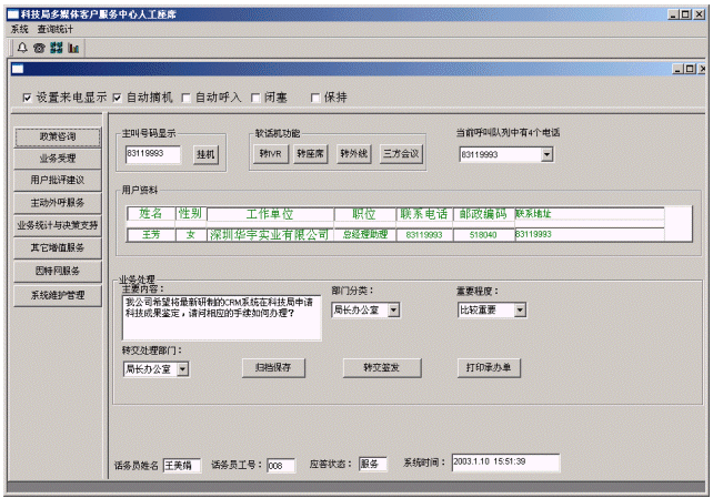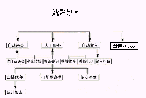 企業(yè)或個人打入電話后,可以選擇人工服務(wù),同座席話務(wù)人員直接溝通,由話務(wù)人員將企業(yè)或個人反映的問題和提出的建議意見記錄下來,并同時記錄下該客戶的聯(lián)系方式,將相關(guān)數(shù)據(jù)添加入系統(tǒng)數(shù)據(jù)庫;也可以在數(shù)據(jù)庫的支持下回答企業(yè)或個人對科技成果和政策法規(guī)的咨詢和疑問。企業(yè)或個人也可以選擇自動語音服務(wù)方式,根據(jù)系統(tǒng)的語音提示輸入按鍵,選擇類別,將自己的投訴和建議以及自己的聯(lián)系方式信息以留言錄音的方式保存在系統(tǒng)中。系統(tǒng)同時還支持自動傳真方式,企業(yè)或個人可以通過傳真機打通客戶服務(wù)中心,通過按鍵選擇傳真方式,將自己的意見建議等的文本內(nèi)容傳真給系統(tǒng),系統(tǒng)自動接受并存入數(shù)據(jù)庫。