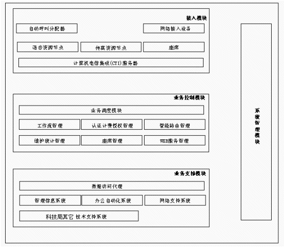 系統(tǒng)管理模塊提供對全系統(tǒng)完善的設(shè)備管理、網(wǎng)絡(luò)管理、運營維護管理、服務(wù)質(zhì)量管理、業(yè)務(wù)信息管理及決策分析等功能,幫助科技局客戶服務(wù)中心運營者用好系統(tǒng),把握市場動態(tài),不斷提高服務(wù)質(zhì)量。