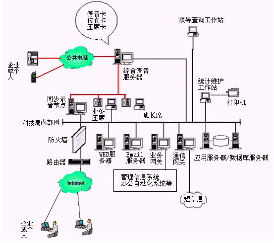 應(yīng)用現(xiàn)代先進的CTI技術(shù)建立的科技局公開電話系統(tǒng),改變了傳統(tǒng)的科技局辦公的一部電話、一支筆、一個本(或用計算機當打字機)的記錄、交流模式。在充分利用各級科技局現(xiàn)有辦公自動化系統(tǒng)基礎(chǔ)上,通過共享科技局、社會網(wǎng)絡(luò)資源,能夠為企業(yè)或個人提供了更多、更好、更便捷的服務(wù)。