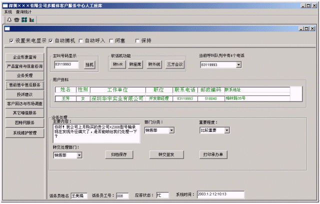 座席前端應用軟件使用全中文的圖形化用戶界面,給座席代表提供最大的易用性,其所實現(xiàn)的功能可以完全根據(jù)家電企業(yè)()提出的要求來定制。