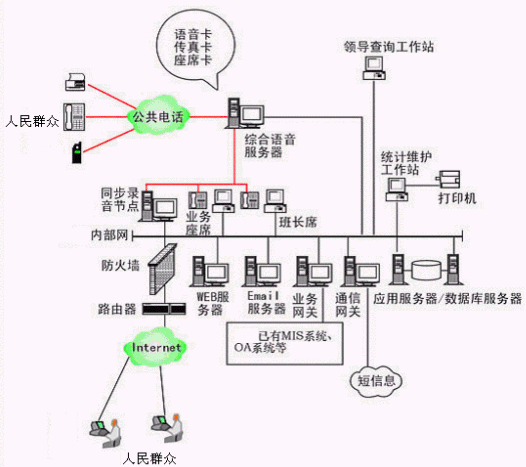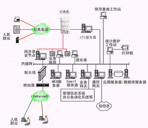 本系統(tǒng)物理結構由排隊交換機、CTI服務器、IVR(交互式語音應答)/IFR(交互式傳真應答)服務器、業(yè)務代表座席(邏輯上分為:普通業(yè)務代表座席、專家座席、WEB座席等)、班長座席、統(tǒng)計維護管理工作站、因特網(wǎng)(WEB)服務器、電子郵件(EMAIL)服務器、數(shù)據(jù)庫/應用服務器、錄音留言工作站、領導查詢工作站、業(yè)務網(wǎng)關服務器、通信網(wǎng)關、網(wǎng)絡系統(tǒng)等和應用軟件構成。
