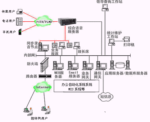 整個(gè)多媒體呼叫中心系統(tǒng)對外面向用戶,對內(nèi)與整個(gè)市勞動(dòng)局相聯(lián)系,與內(nèi)部管理/服務(wù)等結(jié)為一體,能夠把從用戶那里獲得的各種信息、數(shù)據(jù)全部貯存在龐大的數(shù)據(jù)倉庫中,供領(lǐng)導(dǎo)者作分析和決策之用;形成了對外服務(wù)于客戶,對內(nèi)管理、分析、決策系統(tǒng)相結(jié)合的多媒體呼叫中心。