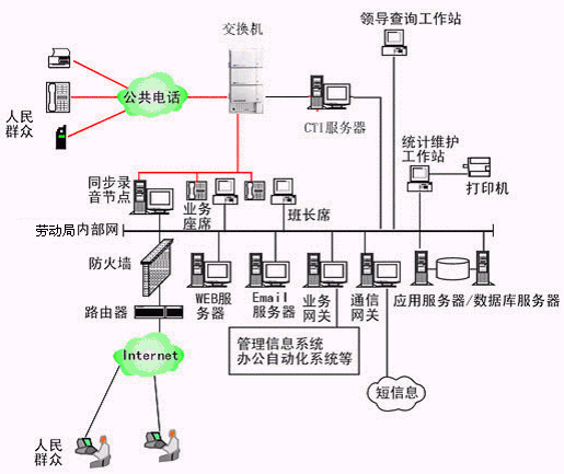 勞動(dòng)局多媒體呼叫中心系統(tǒng)主要是由智能型可編程交換機(jī)或帶語音板卡的工控機(jī)或排隊(duì)交換機(jī)、CTI服務(wù)器、IVR(交互式語音應(yīng)答)/IFR(交互式傳真應(yīng)答)子系統(tǒng)、人工座席子系統(tǒng)、應(yīng)用服務(wù)器、數(shù)據(jù)庫服務(wù)器、業(yè)務(wù)網(wǎng)關(guān)子系統(tǒng)、WEB服務(wù)器、電子郵件服務(wù)器、防火墻、通信網(wǎng)關(guān)等硬件設(shè)備和應(yīng)用軟件組成。