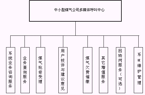 客戶利用電話、手機等撥打某一特服號碼(如9xxxx)進入中小型煤氣公司多媒體呼叫中心系統(tǒng),本系統(tǒng)依托煤氣公司各類業(yè)務技術支持系統(tǒng)和網(wǎng)絡系統(tǒng),通過人工受理或自動語音服務等方式全天24小時不間斷地為客戶提供各種服務。