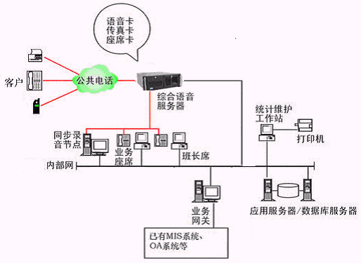 本系統(tǒng)物理結構由帶語音板卡的高性能工控機(稱為綜合語音服務器,在功能上可以分為CTI服務器、IVR(交互式語音應答)/IFR服務器、統(tǒng)計維護管理工作站、數(shù)據(jù)庫/應用服務器、錄音留言工作站、業(yè)務網(wǎng)關服務器、業(yè)務代表座席、網(wǎng)絡系統(tǒng)等和應用軟件構成。