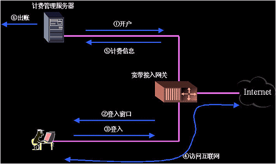 當用戶選擇上網(wǎng)后。管理人員首先通過計費管理服務器為用戶開戶。出用戶在打開瀏覽器試圖訪問Internet時會彈來自接入網(wǎng)關要求登入的窗口。用戶輸入用戶名、密碼并可以選擇適合自己的資費方式。輸入信息后接入網(wǎng)關將信息交由計費管理服務器處理。計費管理服務器驗證通過后,向該用戶開放互聯(lián)網(wǎng)出口。在用戶訪問互聯(lián)網(wǎng)的同時,接入網(wǎng)關計錄下該用戶訪問互聯(lián)網(wǎng)的相關信息,其中包括訪問的時長和數(shù)據(jù)流量。接入網(wǎng)關實時地向計費管理服務器更新用戶的計費信息,用戶斷網(wǎng)后計費管理服務器計算用戶上網(wǎng)費用。