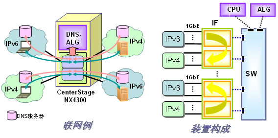 可以在ALG 刀片上搭載將DNS咨詢進行IPv6-IPv4轉(zhuǎn)換的ALG功能。與轉(zhuǎn)換服務(wù)器刀片協(xié)作可以實現(xiàn)IPv6與IPv4的雙方向通信。