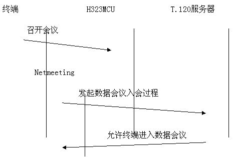 采用帶外方式,數(shù)據(jù)與音頻視頻流分開(kāi),各自占用帶寬。與終端和MCU無(wú)任何關(guān)系。如果用戶(hù)想召開(kāi)數(shù)據(jù)會(huì)議,需要單獨(dú)的一臺(tái)PC機(jī)來(lái)進(jìn)行數(shù)據(jù)的接受與傳送,所有需要數(shù)據(jù)會(huì)議功能的用戶(hù)的PC機(jī)都連接到一個(gè)T.120服務(wù)器上。目前常用的終端軟件是Netmeeting軟件。數(shù)據(jù)占用單獨(dú)的帶寬,不擠占音視頻的帶寬。會(huì)議建立過(guò)程為: