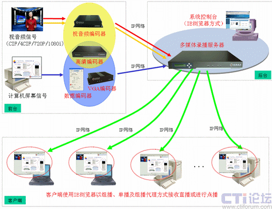 可通過單播或組播方式將會議現(xiàn)場的視頻、音頻、計算機(jī)動態(tài)屏幕在網(wǎng)絡(luò)上進(jìn)行實(shí)時直播,用戶可通過IE瀏覽器登錄服務(wù)器實(shí)時接收直播的視頻、音頻和計算機(jī)動態(tài)屏幕內(nèi)容。系統(tǒng)獨(dú)家支持組播代理功能,無須更改網(wǎng)絡(luò)設(shè)備的設(shè)置即可實(shí)現(xiàn)跨網(wǎng)段的組播。系統(tǒng)獨(dú)家支持文件組播功能,可將錄制好的文件在網(wǎng)絡(luò)上再次進(jìn)行組播。