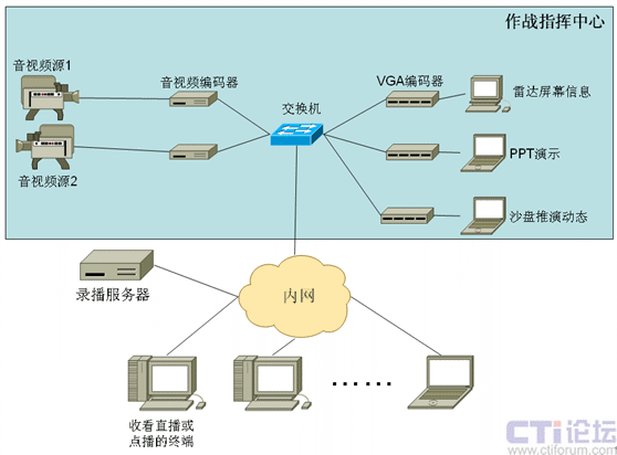 在軍隊系統(tǒng)中比較典型的應(yīng)用是軍隊作戰(zhàn)演習(xí)的錄播。軍隊中常會進(jìn)行軍事演習(xí)、網(wǎng)上模擬對抗訓(xùn)練,以此來增強(qiáng)現(xiàn)代化軍隊的作戰(zhàn)能力,演習(xí)指揮部在作戰(zhàn)指揮中心通過大屏等顯示設(shè)備全盤了解對抗雙方動態(tài),以往缺乏有效的演習(xí)記錄手段,不利于事后分析及總結(jié)經(jīng)驗(yàn)教訓(xùn)。會易錄支持多路AV和VGA信號的同步組合錄制,可以把演習(xí)過程中作戰(zhàn)指揮中心顯示的信息進(jìn)行全面的錄制,如對抗雙方的視音頻信息、網(wǎng)上沙盤推演動態(tài),雷達(dá)屏幕信息等內(nèi)容,同時也可以通過網(wǎng)絡(luò)將上述信息實(shí)時傳送給上級部門來進(jìn)行網(wǎng)上演習(xí)的在線觀摩。該錄播系統(tǒng)的典型框圖如下: