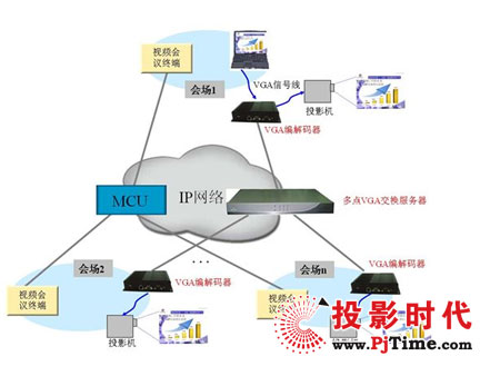 視頻會議系統(tǒng)帶外硬雙流解決方案的核心是基于IP網(wǎng)絡(luò)實(shí)現(xiàn)VGA信號的采集編碼、多點(diǎn)交換、解碼顯示。在本方案中,通過VGA編解碼器實(shí)現(xiàn)VGA信號的采集編碼及解碼顯示,VGA信號的多點(diǎn)交換則通過多點(diǎn)VGA交換服務(wù)器實(shí)現(xiàn),因采用硬件方式實(shí)現(xiàn)VGA信號的編解碼,且VGA信號流在視頻會議視音頻信號流之外傳送,故稱“帶外硬雙流”。采用帶外硬雙流解決方案,組網(wǎng)靈活,管理方便,可以配合任何制式及品牌的視頻會議實(shí)現(xiàn)雙流功能。