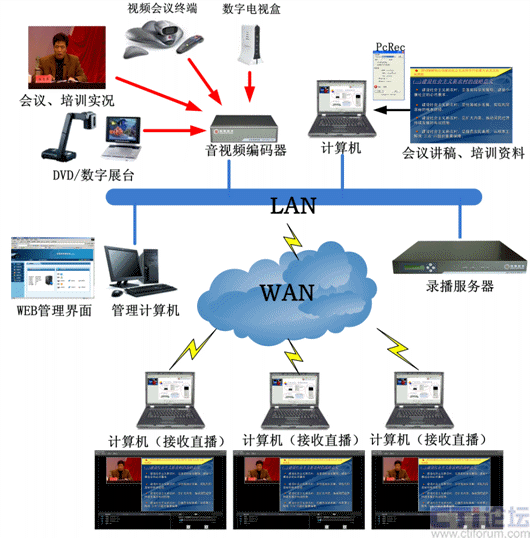 如上圖所示,會(huì)易錄采用前后臺(tái)分離模式,前臺(tái)設(shè)備(視音頻編碼器、數(shù)據(jù)編碼器)負(fù)責(zé)信號(hào)采集;后臺(tái)設(shè)備(多媒體錄播服務(wù)器)負(fù)責(zé)信號(hào)處理。前后臺(tái)設(shè)備之間通過(guò)IP網(wǎng)絡(luò)進(jìn)行通訊。上述編碼器可將采集到的視音頻信號(hào)和計(jì)算機(jī)屏幕信號(hào)編碼后通過(guò)網(wǎng)絡(luò)發(fā)送到后臺(tái)的多媒體錄播服務(wù)器,多媒體錄播服務(wù)器可將收到的視音頻信號(hào)和計(jì)算機(jī)屏幕信號(hào)進(jìn)行同步一體化的錄制、直播、點(diǎn)播。
