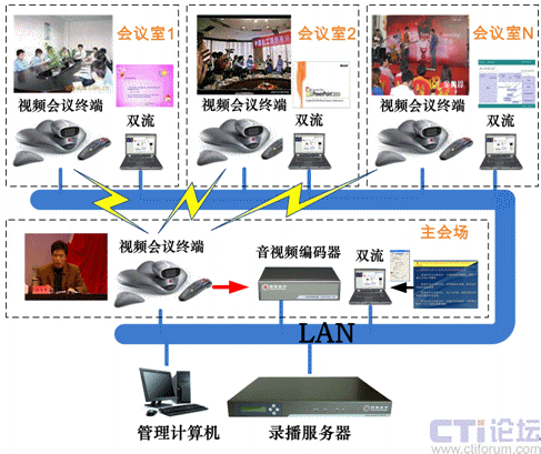 當(dāng)需要錄制沒(méi)有錄播的其他會(huì)議室實(shí)況時(shí),通過(guò)主會(huì)場(chǎng)視頻會(huì)議終端呼叫任意會(huì)場(chǎng)的終端,即可錄制任意會(huì)場(chǎng)的會(huì)議實(shí)況,如下圖: