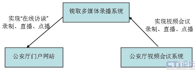 銳取多媒體錄播系統(tǒng)采用了分布式的架構,前端的視音頻編碼器負責視音頻信號的采集,后臺的多媒體錄播服務器負責信號的錄制、直播和點播。前端的視音頻編碼器可從視頻會議系統(tǒng)中獲取信號,這樣“在線訪談”的公安機關領導或專家可以在視頻會議中的任何一個會場與廣大網民在線交流。
