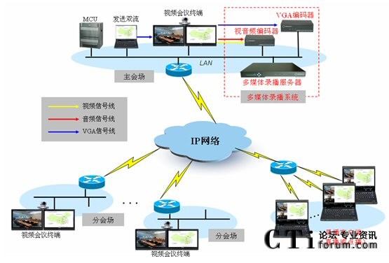 銳取多媒體錄播系統(tǒng)部署在中國疾控中心主會場,通過視音頻編碼器及VGA編碼器采集視頻會議終端輸出的本地、遠端會議及雙流圖像,并通過IP網(wǎng)絡(luò)將采集的信號編碼后發(fā)送給位于機房的多媒體錄播服務(wù)器,由服務(wù)器實現(xiàn)視頻會議的錄制、直播、點播。分會場及不具備視頻會議設(shè)備的會議可通過IE瀏覽器訪問多媒體錄播服務(wù)器,接收會議的實時直播或進行事后點播。