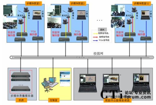 華東師大多媒體錄播項目系統(tǒng)組網(wǎng)如上圖所示。在本項目中12間多媒體教室內(nèi)均實現(xiàn)錄播功能,編碼器和多媒體錄播服務(wù)器分別部署在教室和機房內(nèi),管理員在控制室通過網(wǎng)絡(luò)進行遠程管理、控制,老師、學(xué)生可在教室、辦公室、宿舍等任何可以連接校園網(wǎng)的地方實時觀看各間教室內(nèi)進行的課程,可滿足日常多媒體教學(xué)、課件錄制、微格教學(xué)等應(yīng)用的需要。其中涉及銳取設(shè)備清單及說明如下:
