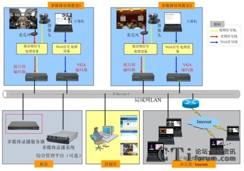 如上圖所示,銳取多媒體錄播成功實(shí)現(xiàn)了中國電力投資集團(tuán)高級(jí)培訓(xùn)中心兩間多媒體教室內(nèi)培訓(xùn)課程的錄制、直播和后期點(diǎn)播。銳取多媒體錄播前端的編碼器部署在多媒體教室,編碼器采集培訓(xùn)的PPT和老師講課的圖像聲音編碼后通過網(wǎng)絡(luò)傳送給機(jī)房的多媒體錄播服務(wù)器,多媒體錄播服務(wù)器實(shí)現(xiàn)培訓(xùn)過程中“教師學(xué)生圖像聲音+老師講稿(PPT)”的同步錄制、直播、點(diǎn)播。