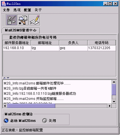 此窗口主要用來(lái)顯示Mail2SMS與所監(jiān)控郵箱的連接狀態(tài),及啟動(dòng)與關(guān)閉Mail2SMS的監(jiān)控功能。如上圖所示點(diǎn)擊