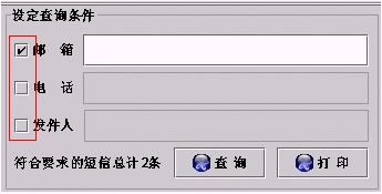 ·也可以通過(guò)給定查詢(xún)條件來(lái)查詢(xún)某項(xiàng)內(nèi)容,如針對(duì)某個(gè)郵箱、手機(jī)電話或發(fā)件人,方法是通過(guò)點(diǎn)擊左邊的小方框來(lái)選中,然后輸入相應(yīng)內(nèi)容即可,如下圖: