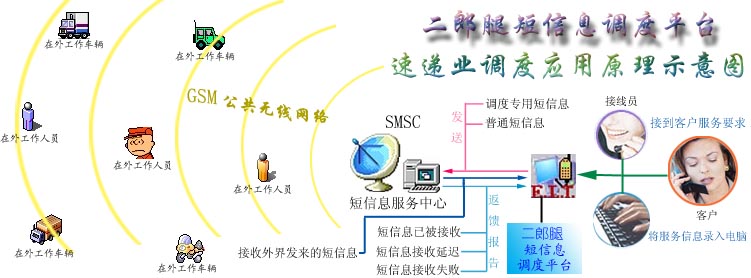 二郎腿短信息調(diào)度平臺是利用目前社會(huì)上大眾普遍擁有手機(jī)的現(xiàn)成資源,通過移動(dòng)通訊公司提供的短信息服務(wù)功能作為通信信道,直接對手機(jī)進(jìn)行低層操作控制,以“收發(fā)短信息”的方式來實(shí)現(xiàn)信息的傳遞(通信資費(fèi)標(biāo)準(zhǔn)與在手機(jī)上收發(fā)短信相同)。調(diào)度平臺還對每條發(fā)出的信息的接收狀態(tài)進(jìn)行跟蹤,確保信息能被安全