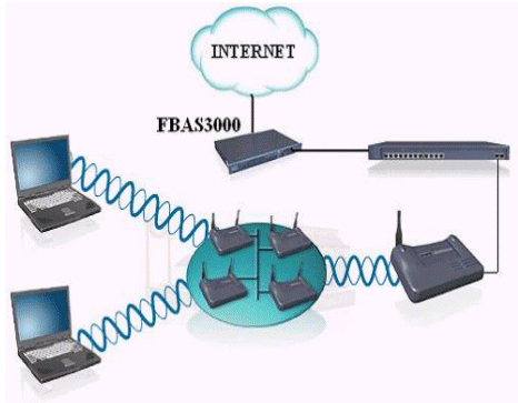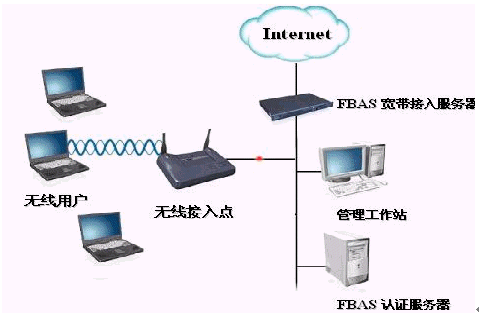 移動(dòng)用戶通過(guò)自身的無(wú)線網(wǎng)卡傳遞信息到熱點(diǎn)接收器上,熱點(diǎn)接收器連接到交換機(jī)(是為了能具有更好的可拓展性),交換機(jī)連接到華夏科技FutureWorks寬帶計(jì)費(fèi)系統(tǒng)的FBAS接入服務(wù)器上,通過(guò)接入服務(wù)器連接到INTERNET.這里的FBAS3000系列的寬帶接入服務(wù)器采用的是一體機(jī)的模式,接入,認(rèn)證,計(jì)費(fèi)等一系列服務(wù)均安裝在FBAS里,這樣可以簡(jiǎn)化網(wǎng)絡(luò)結(jié)構(gòu)。對(duì)FBAS的操作是通過(guò)WEB頁(yè)面來(lái)進(jìn)行設(shè)置維護(hù)的,