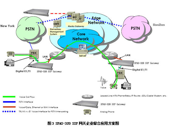 如圖3所示,企業(yè)所采用的接入方式,如ADSL、DDN、寬帶等接入Internet,只需要在原有網(wǎng)絡(luò)基礎(chǔ)上加載SPAS-320 SIP通信網(wǎng)關(guān),即可將原有的數(shù)據(jù)和語(yǔ)音網(wǎng)絡(luò)連接起來(lái),組建企業(yè)統(tǒng)一語(yǔ)音專網(wǎng),在各個(gè)辦事處,企業(yè)不需要配備PBX,網(wǎng)關(guān)就可以提供PBX功能。如呼叫轉(zhuǎn)接、三方通話、來(lái)電顯示、語(yǔ)音提示等,并可充當(dāng)代理服務(wù)器,提供上網(wǎng)服務(wù)。
