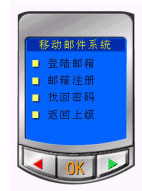 進(jìn)入移動(dòng)郵件系統(tǒng)后,可分別選擇"登陸郵箱、郵箱注冊(cè)、找回密碼、返回上級(jí)"來(lái)進(jìn)行下一步操作。