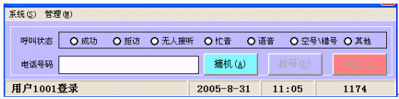 - 坐席功能,坐席人員通過電腦鼠標操作,取新客戶資料,點擊撥號,同時,用鼠標操作記錄撥號過程和通話過程的一些設置(撥號成功、忙線、無人接、客戶反饋信息等)。坐席電腦將分類顯示忙線電話列表、無人接電話列表、感興趣客戶列表等信息,以便做下一輪撥號參考。