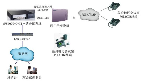 MPS2000-C電話會議系統(tǒng)通過數(shù)字中繼(采用ISDN信令)與溫州電力原有的西門子交換機互聯(lián),作為會議應用服務器,為溫州電力原有電話網(wǎng)絡內(nèi)的用戶提供電話會議功能。