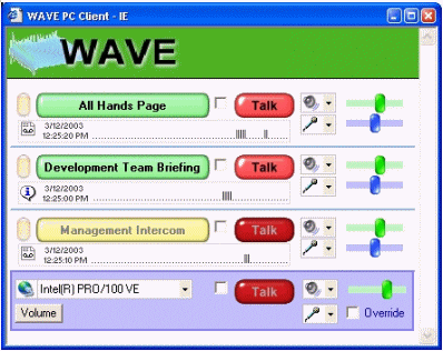 WAVE的使用方式為:管理員在服務(wù)器端建立IP電話會(huì)議,參加者使用本地計(jì)算機(jī)作為客戶端,通過耳機(jī)和麥克風(fēng)即可加入會(huì)議。一臺(tái)普通的奔四PC機(jī)可以支持?jǐn)?shù)千個(gè)會(huì)議,每個(gè)會(huì)議也允許數(shù)百個(gè)用戶參加。管理員可以分配用戶不同的權(quán)利:如講話,主持會(huì)議等等。