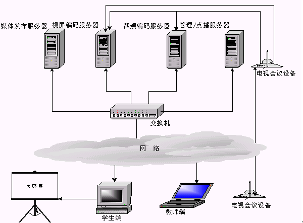 當(dāng)老師端在異地時(shí)(攝像頭離服務(wù)器較遠(yuǎn),無(wú)法物理連接),可通過(guò)"電視會(huì)議系統(tǒng)"將老師的圖像及聲音實(shí)時(shí)傳送到編碼服務(wù)器,桌面課件可以通過(guò)PcAnywhere傳送到編碼服務(wù)器。圖像,聲音和桌面課件通過(guò)Web Streaming采集壓縮并在網(wǎng)上實(shí)時(shí)廣播。這種系統(tǒng)架構(gòu)也是當(dāng)今功能比較齊全和完善的一種實(shí)現(xiàn)方式。