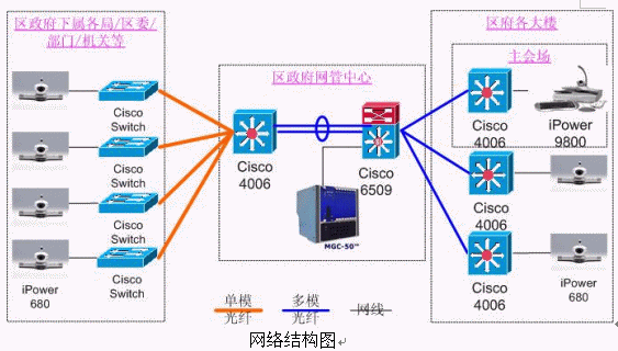 9800,分會場使用iPower 680。網管中心安放一臺Polycom 公司的MGC-50(多點會議控制單元),用于對全網終端的控制,實現多點間、點對點會議。各視頻設備通過網線連接在各主要交換機上。