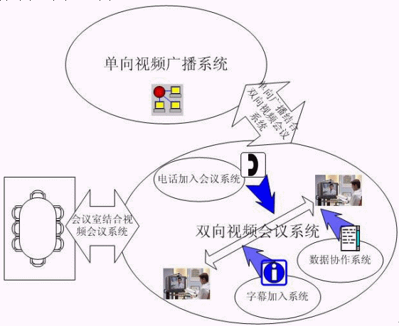 為了讓系統(tǒng)成為一個真正的整體解決方案,而不是簡單的各種系統(tǒng)的堆砌,本系統(tǒng)設計的視頻會議系統(tǒng)不僅考慮每個系統(tǒng)的完整性,在設計中也著重考慮通過各自的結合,包括雙向視頻會議和單向視頻廣播之間的結合,雙向視頻會議和會議室集成的結合,再加上數據協作、電話加入功能和字幕加入功能,真正建設一個全面的多媒體結合視頻會議系統(tǒng)的應用。
