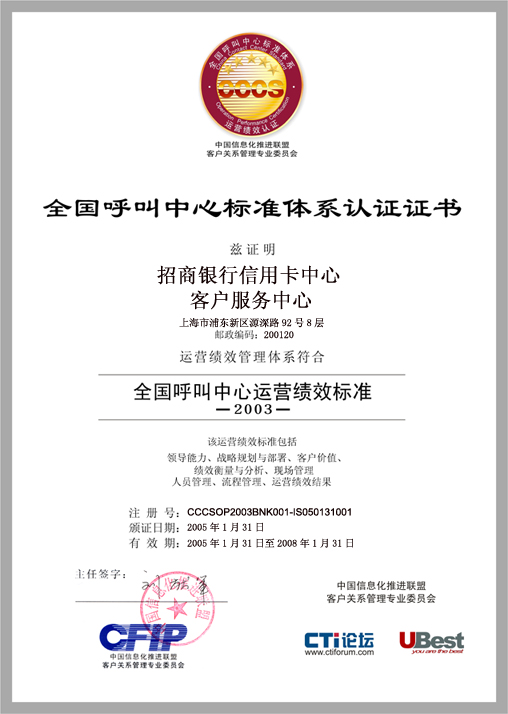 經(jīng)過長(zhǎng)達(dá)8個(gè)月時(shí)間的準(zhǔn)備和嚴(yán)格的認(rèn)證審核,由中國(guó)信息化推進(jìn)聯(lián)盟客戶關(guān)系管理專業(yè)委員會(huì)常務(wù)副主任郭晨東先生親自掛帥組成的項(xiàng)目評(píng)審專家小組從領(lǐng)導(dǎo)能力、戰(zhàn)略規(guī)劃與部署、客戶價(jià)值、績(jī)效衡量與分析、現(xiàn)場(chǎng)管理、人員管理、流程管理、運(yùn)營(yíng)績(jī)效結(jié)果等八個(gè)范疇對(duì)招商銀行信用卡中心客戶服務(wù)部進(jìn)行了全面而嚴(yán)格的審核,涉及五大類上百項(xiàng)詳細(xì)的運(yùn)營(yíng)績(jī)效指標(biāo),歷經(jīng)初審評(píng)估、現(xiàn)場(chǎng)初審、初審評(píng)估報(bào)告提交與確認(rèn)、標(biāo)準(zhǔn)試運(yùn)行、績(jī)效全面提升、最終評(píng)審等階段,最終審核確認(rèn)招商銀行信用卡中心客戶服務(wù)完全符合并部分超越《全國(guó)呼叫中心運(yùn)營(yíng)績(jī)效標(biāo)準(zhǔn)》(CCCS-OP-2003)的各項(xiàng)標(biāo)準(zhǔn)指標(biāo)和要求,于2005年1月31日正式批準(zhǔn)招商銀行信用卡中心通過該標(biāo)準(zhǔn)的五星級(jí)認(rèn)證,授予“五星級(jí)客戶服務(wù)中心”稱號(hào)。