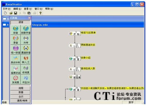 兩個集成環(huán)境,Easy Studio負責自動語音流程的編輯和調(diào)試,EasyAdmin負責對語音卡硬件的操作和按照EasyStudio生成的具體語音流程的實現(xiàn)。EasyCTI綜合實現(xiàn)了呼叫中心中IVR(Interactive