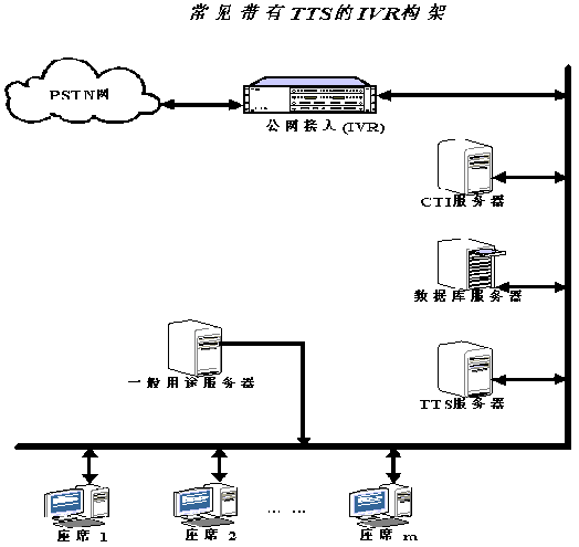 一般的公網(wǎng)接入(IVR)大都采用工控機+語音板卡,而合成的語音數(shù)據(jù)則通過局域網(wǎng)傳給IVR。這種結(jié)構(gòu)只適用于簡單的應(yīng)用場合。