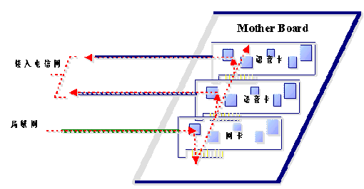 通過局域網(wǎng)傳遞語音數(shù)據(jù)本來就不能保證其時實時性,其結(jié)果就是用戶聽到的語音經(jīng)常斷續(xù),保證不了語音質(zhì)量。如果傳遞的語音數(shù)據(jù)是經(jīng)過壓縮的,語音數(shù)據(jù)本來就是通過TTS進行合成的,再經(jīng)過壓縮,則音質(zhì)會有很大的損傷,因此同樣保證不了語音質(zhì)量。從上圖中我們可以看到,經(jīng)TTS合成的語音數(shù)據(jù)從局域網(wǎng)經(jīng)過網(wǎng)卡,再通過主板PCI(或ISA)總線進入語音卡,最后進入電信網(wǎng),同樣語音數(shù)據(jù)通過計算機主板經(jīng)PCI(或ISA)總線進入語音卡也要求是實時的。這兩種實時性的要求會導(dǎo)致在接入量比較大的情況下,會給計算機的總線造成很大的負擔(dān)。因為總線的帶寬(數(shù)據(jù)吞吐量)是有限的。況且其它的板卡和接口(如聲卡、顯示卡等)也要直接或間接地占用總線。因此在接入量比較大的情況下,計算機的總線帶寬會成為一個比較關(guān)鍵的瓶頸。即便提高語音板卡的接入能力。在有大量電話接入的情況下,由于語音數(shù)據(jù)實時性的要求,也不能保證語音質(zhì)量。