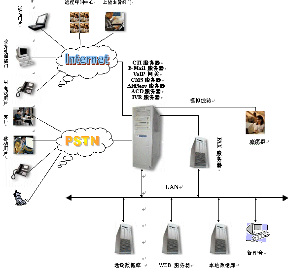 另一方面,CTI(計(jì)算機(jī)語音集成)技術(shù)的出現(xiàn),實(shí)現(xiàn)了通信技術(shù)與計(jì)算機(jī)技術(shù)的結(jié)合,利用計(jì)算機(jī)技術(shù)可以大大增加服務(wù)的信息量、提高速度、拓展新型客戶服務(wù)業(yè)務(wù)。因此為了滿足計(jì)算機(jī)、信息技術(shù)的演進(jìn)和客戶服務(wù)的需求,利用CTI技術(shù),面向用戶,提供綜合服務(wù)的客戶服務(wù)中心系統(tǒng)應(yīng)運(yùn)而生。對(duì)于用戶,客戶服務(wù)中心系統(tǒng)能夠提供更優(yōu)質(zhì)的用戶服務(wù),用戶能從服務(wù)方得到最快的響應(yīng),能夠得到24小時(shí)的持續(xù)服務(wù),能夠同時(shí)得到語音、圖象、數(shù)據(jù)多方面的信息支持。對(duì)于企業(yè),客戶服務(wù)中心在提高客戶服務(wù)質(zhì)量的同時(shí),還能有效的控制成本、增加收入,樹立專業(yè)化的企業(yè)形象,建立完善的客戶服務(wù)資料庫。