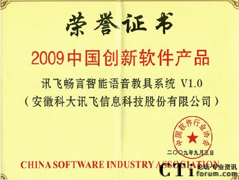 CTI論壇(ctiforum)9月8日消息:日前,訊飛暢言語音教具系統(tǒng)榮獲“2009中國創(chuàng)新軟件產(chǎn)品”。