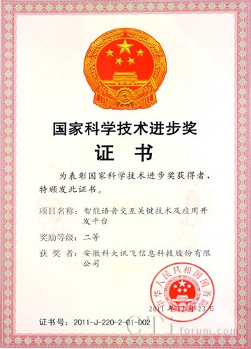 CTI論壇(ctiforum)2月20日消息(記者 浩宇):2月14日,2011年度國(guó)家科學(xué)技術(shù)獎(jiǎng)勵(lì)大會(huì)在北京隆重舉行,黨和國(guó)家領(lǐng)導(dǎo)人胡錦濤、溫家寶、李長(zhǎng)春、李克強(qiáng)出席大會(huì)并為獲獎(jiǎng)代表頒獎(jiǎng)。由科大訊飛和中國(guó)科學(xué)技術(shù)大學(xué)聯(lián)合提交的“智能語(yǔ)音交互關(guān)鍵技術(shù)及應(yīng)用開(kāi)發(fā)平臺(tái)”項(xiàng)目榮獲國(guó)家科技進(jìn)步二等獎(jiǎng),在本年度信息化領(lǐng)域(計(jì)算機(jī)與自動(dòng)控制、通信、現(xiàn)代服務(wù)業(yè)信息化等專業(yè)組)一等獎(jiǎng)空缺的情況下,該項(xiàng)目在計(jì)算機(jī)與自動(dòng)控制專業(yè)組所有項(xiàng)目中排名第一。這是科大訊飛第二次獲得這一國(guó)家獎(jiǎng)重大榮譽(yù),也是語(yǔ)音產(chǎn)業(yè)界唯一獲此殊榮的企業(yè)。